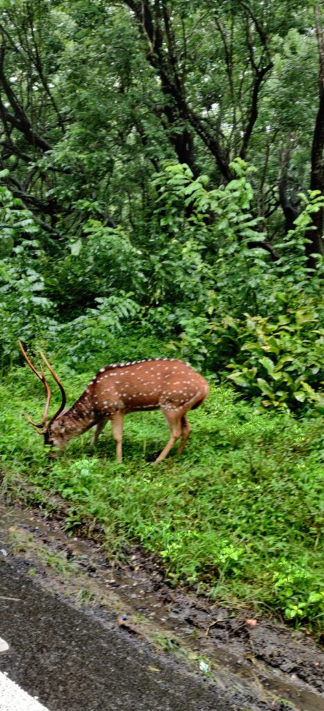 After spending sufficient time at the facility, our next sighting is the velvety herd of Deer. Watching them so closely the elegant, smooth-on-the-feet animal seems to be a little restless. Wriggling furiously to shed the wet, skin quivering, is just meters away. From amidst the green this velvety brown spotted deer herd, known for staying in groups waited for the family to join them, for a moment I thought they all looked at me and I was surely staring at them, though seen many times earlier, today is the closest.